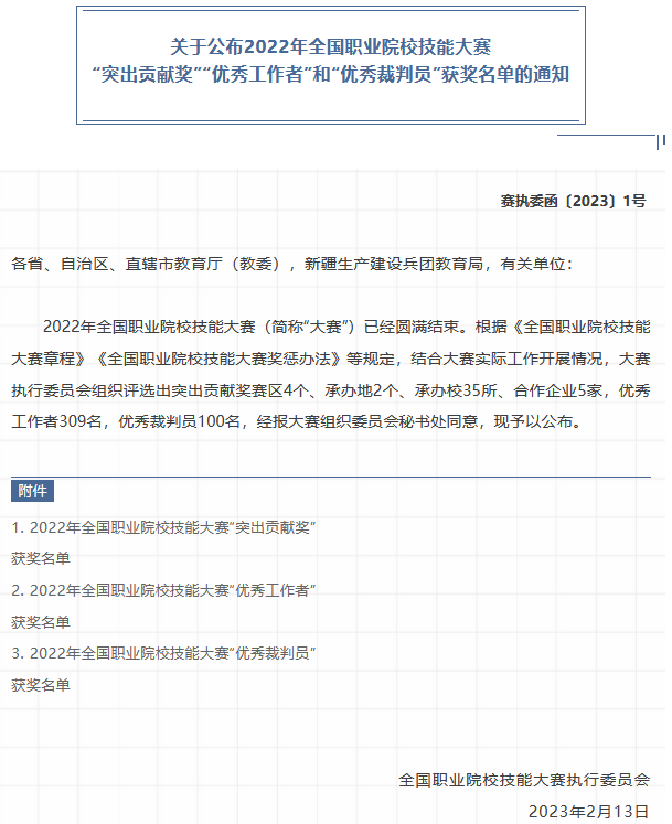 2月13日,全国职业院校技能大赛执行委员会发布了《关于公布2022年全国职业院校技能大赛“突出贡献奖”“优秀工作者”和“优秀裁判员”获奖名单的通知》,我院智能制造学院副教授郎朗被评为2022年全国职业院校技能大赛“优秀裁判员”。