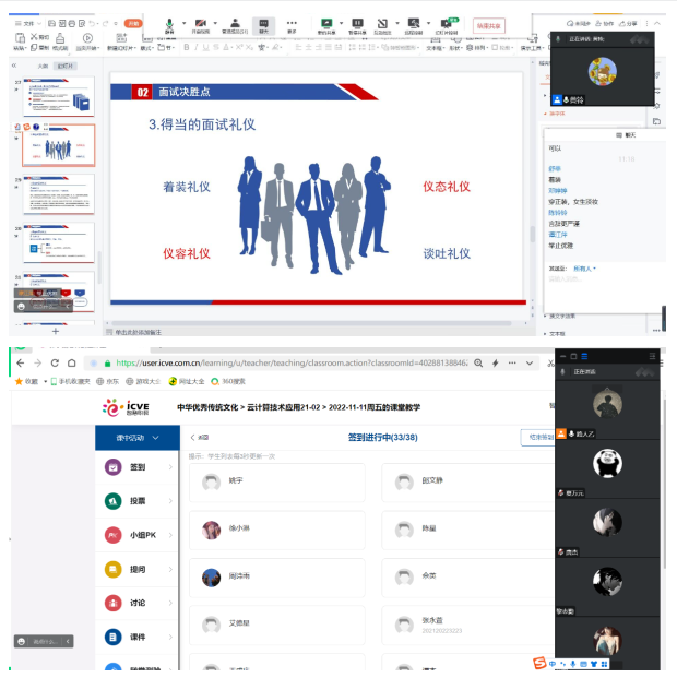 为保障线上教学效果,金年会app副书记潘雪,教学督导易前伟、熊玲及教学科管理人员随机进入线上课堂,对教学过程进行在线督导,有效保障在线教学质量。从督查情况看,线上教学平台总体运行平稳;任课教师备课充分,学生到课准时,参与线上课堂互动积极性高,线上教学开展井然有序。