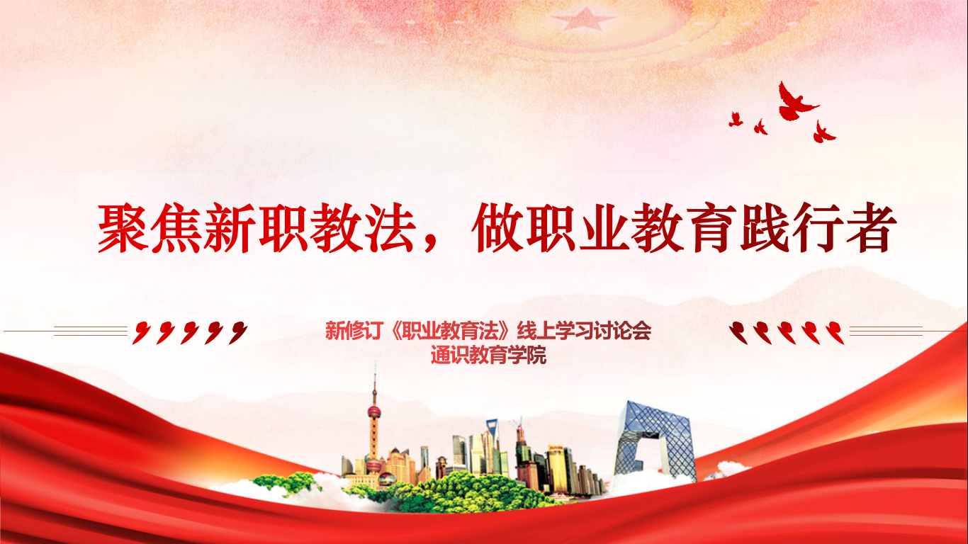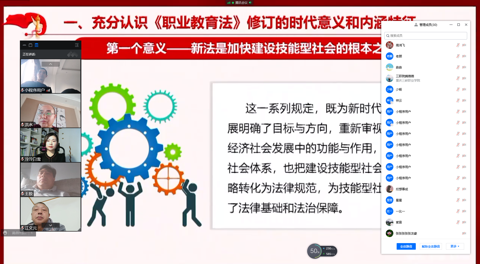 新修订的《中华人民共和国职业教育法》(以下简称“新职教法”)自2022年5月1日起施行。为全面贯彻新修订的《职业教育法》,加快学院高质量发展,金年会app于5月16日晚7点在腾讯会议召开《职业教育法》线上学习讨论会,以加强教职工对职业教育法的理解,明确其修订意义、进一步增强工作信心。会议由金年会app副院长潘雪主持,金年会app全体教职工参会。